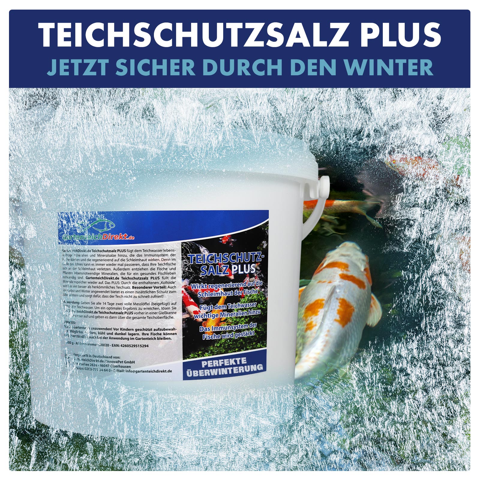 Gartenteich-Direkt Teichschutzsalz PLUS fügt dem Teichwasser lebenswichtige Mineralien und Mineralsalze hinzu, die das Immunsystem der Fische stärken und die regenerierend auf die Schleimhaut wirken. Denn im Laufe des Jahres kann es immer wieder mal passieren, dass Ihre Teichfische sich an der Schleimhaut verletzen. Außerdem entziehen die Fische und Pflanzen lebensnotwendige Mineralien, die für ein gesundes Fischleben notwendig sind. Gartenteich-Direkt Teichschutzsalz PLUS füllt die Mineralienspeicher wieder auf. Das PLUS: Durch die enthaltenen „Kolloide“ wirkt es viel besser als herkömmliches Teichsalz. Besonderer Vorteil: Auch im Herbst und Winter angewendet bietet es einen zusätzlichen Schutz zum Überwintern und sorgt dafür, dass der Teich nicht zu schnell zufriert!